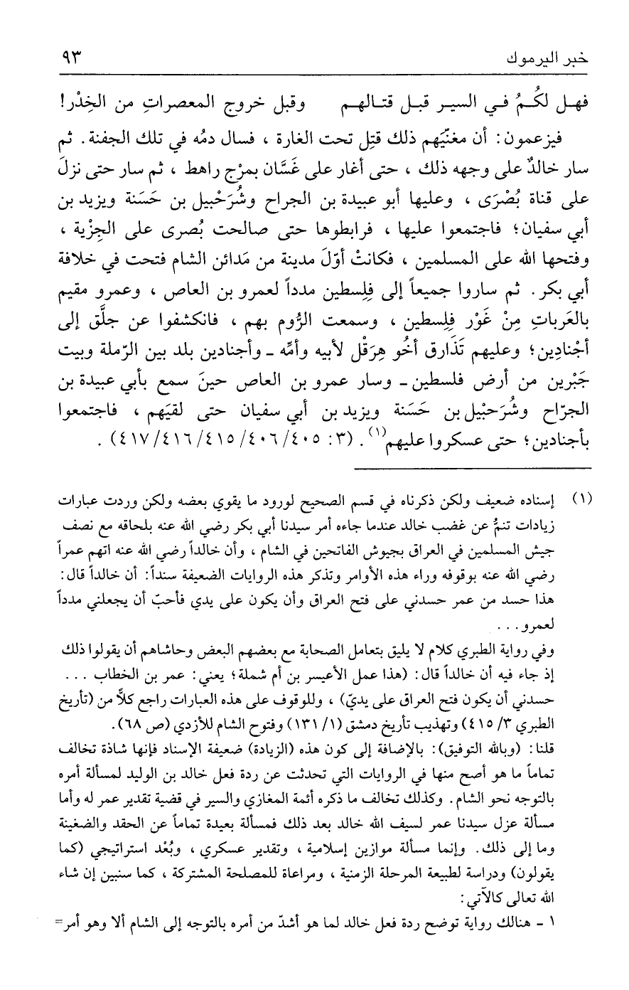 (١) إسناده ضعيف ولكن ذكرناه في قسم الصحيح لورود ما يقوي بعضه ولكن وردت عبارات زيادات تنمُّ عن غضب خالد عندما جاءه أمر سيدنا أبي بكر رضي الله عنه بلحاقه مع نصف جيش المسلمين في العراق بجيوش الفاتحين في الشام، وأن خالدًا رضي الله عنه اتهم عمرًا رضي الله عنه بوقوفه وراء هذه الأوامر وتذكر هذه الروايات الضعيفة سندًا: أن خالدًا قال: هذا حسد من عمر حسدني على فتح العراق وأن يكون على يدي فأحبّ أن يجعلني مددًا لعمرو ...