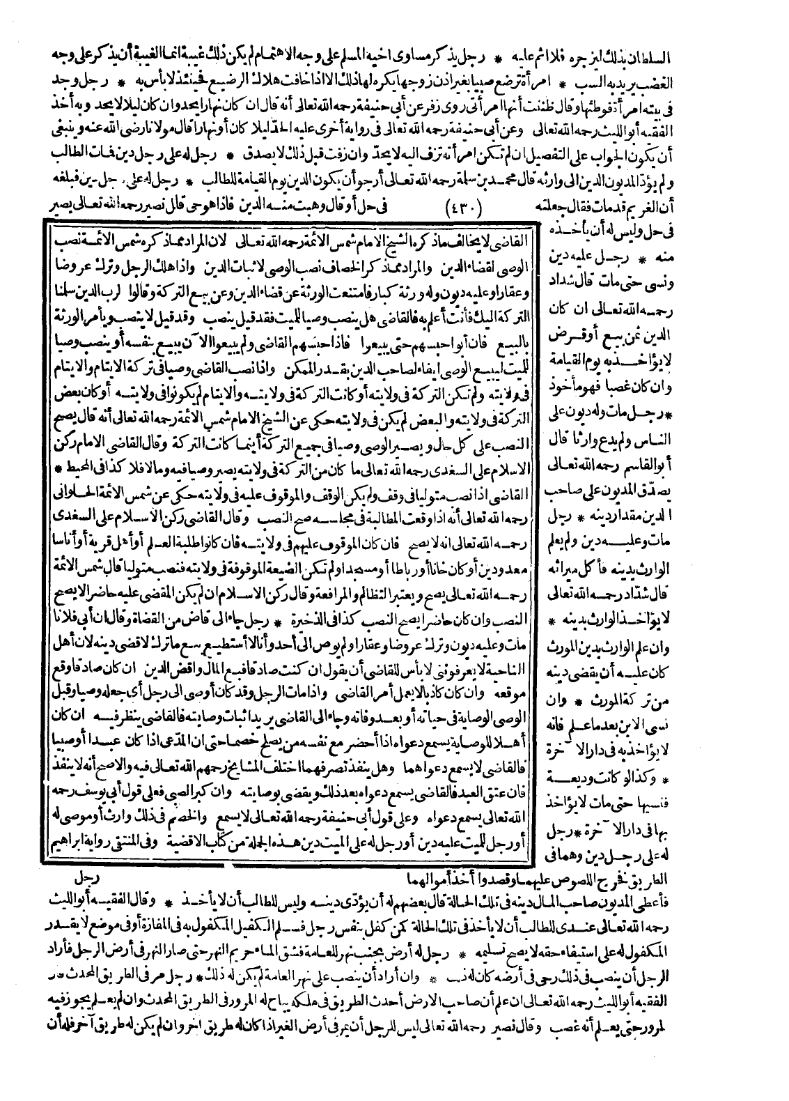 وَإِذَا هَلَكَ الرَّجُلُ وَتَرَكَ عُرُوضًا وَعَقَارًا وَعَلَيْهِ دُيُونٌ وَلَهُ وَرَثَةٌ كِبَارٌ فَامْتَنَعَتْ الْوَرَثَةُ عَنْ قَضَاءِ الدَّيْنِ وَعَنْ بَيْعِ التَّرِكَةِ وَقَالُوا لِرَبِّ الدَّيْنِ: سَلَّمْنَا التَّرِكَةَ إلَيْكَ فَأَنْت أَعْلَمُ بِهِ، فَالْقَاضِي هَلْ يَنْصِبُ وَصِيًّا لِلْمَيِّتِ؟ فَقَدْ قِيلَ: يَنْصِبُ، وَقَدْ قِيلَ: لَا يَنْصِبُ وَيَأْمُرُ الْوَرَثَةَ بِالْبَيْعِ، فَإِنْ أَبَوْا حَبَسَهُمْ حَتَّى يَبِيعُوا، فَإِذَا حَبَسَهُمْ الْقَاضِي، وَلَمْ يَبِيعُوا الْآنَ يَبِيعُ بِنَفْسِهِ، أَوْ يَنْصِبُ وَصِيًّا لِلْمَيِّتِ لِيَبِيعَ الْوَصِيُّ إيفَاءً لِصَاحِبِ الدَّيْنِ بِقَدْرِ الْمُمْكِنِ، وَإِذَا نَصَبَ الْقَاضِي وَصِيًّا فِي تَرِكَةِ الْأَيْتَامِ وَالْأَيْتَامُ فِي وِلَايَتِهِ، وَلَمْ تَكُنْ التَّرِكَةُ فِي وِلَايَتِهِ، أَوْ كَانَتْ التَّرِكَةُ فِي وِلَايَتِهِ وَالْأَيْتَامُ لَمْ يَكُونُوا فِي وِلَايَتِهِ، أَوْ كَانَ بَعْضُ التَّرِكَةِ فِي وِلَايَتِهِ وَالْبَعْضُ لَمْ يَكُنْ فِي وِلَايَتِهِ حُكِيَ عَنْ الشَّيْخِ الْإِمَامِ شَمْسِ الْأَئِمَّةِ - رَحِمَهُ اللَّهُ تَعَالَى - أَنَّهُ قَالَ: يَصِحُّ النَّصْبُ عَلَى كُلِّ حَالٍ وَيَصِيرُ الْوَصِيُّ وَصِيًّا فِي جَمِيعِ التَّرِكَةِ أَيْنَمَا كَانَتْ التَّرِكَةُ وَقَالَ الْقَاضِي الْإِمَامُ رُكْنُ الْإِسْلَامِ عَلِيٌّ السُّغْدِيُّ - رَحِمَهُ اللَّهُ تَعَالَى -: مَا كَانَ مِنْ التَّرِكَةِ فِي وِلَايَتِهِ يَصِيرُ وَصِيًّا فِيهِ وَمَا لَا فَلَا، كَذَا فِي الْمُحِيطِ.