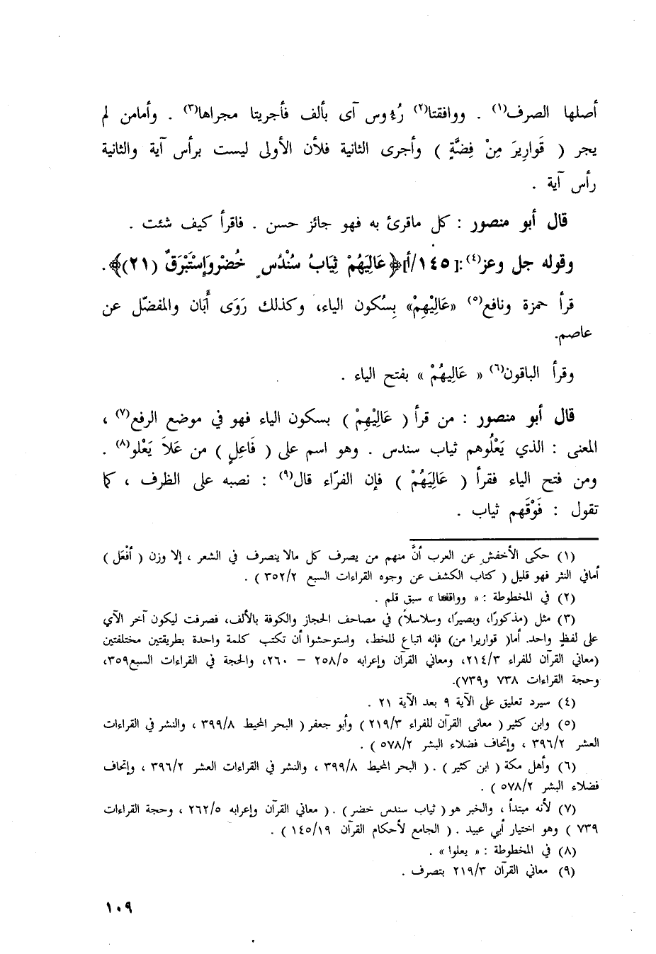 قال أبو منصور: من قرأ (عَالِيْهِمْ) بسكون الياء فهو في موضع الرفع،