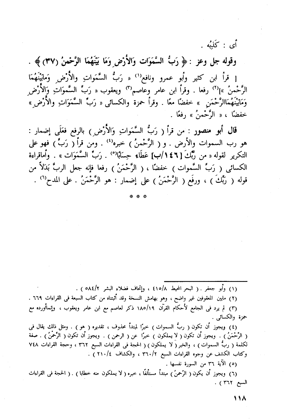 قرأ ابن كثير وأبو عمرو ونافع (رَبُّ السَّمَاوَاتِ وَالْأَرْضِ وَمَا بَيْنَهُمَا الرَّحْمَنُ) رفعا.