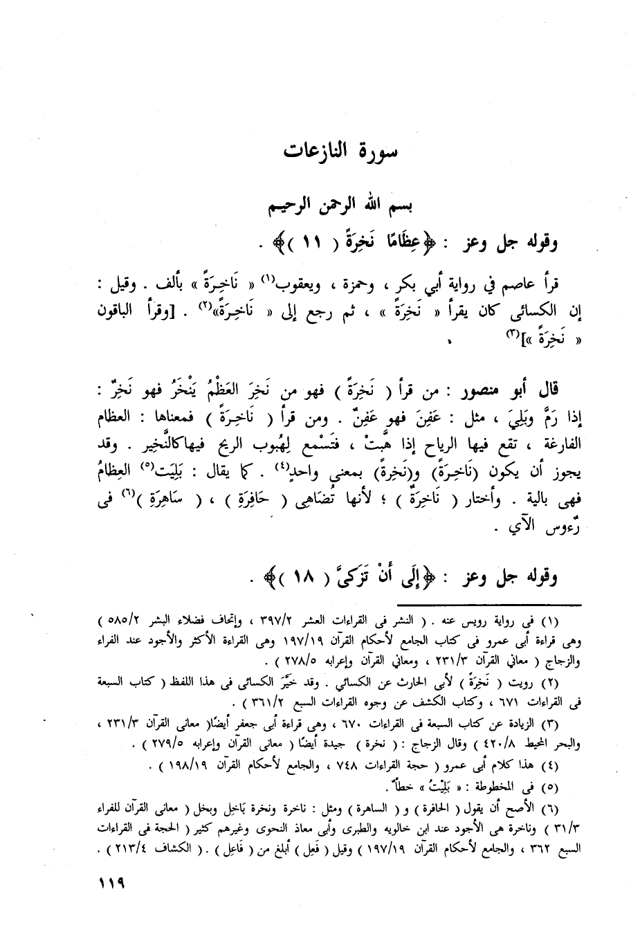 ومن قرأ (نَاخِرَةً) فمعناها: العظام الفارغة، تقع فيها الرياح إذا هبتْ، فتَسمع لِهُبوب الريح فيها كالنخِير.
