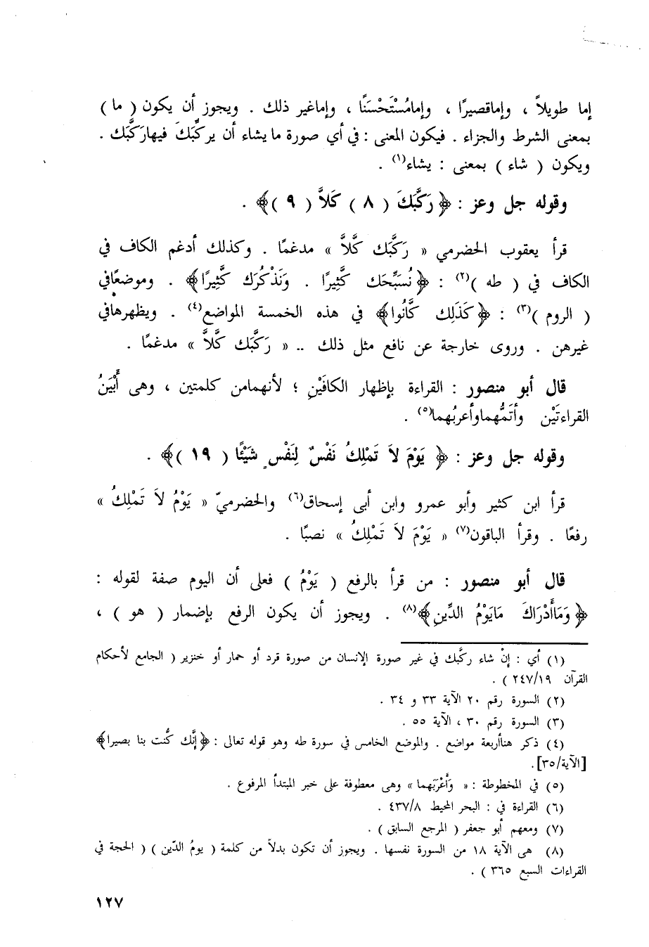 وكذلك أدغم الكاف في الكاف في (طه) : (نُسَبِّحَك كثيرًا. وَنَذْكُرَك كَثِيرًا) . وموضعٍا في (الروم) : (كَذَلِك كَّانُوا) في هذه الخمسة المواضع.