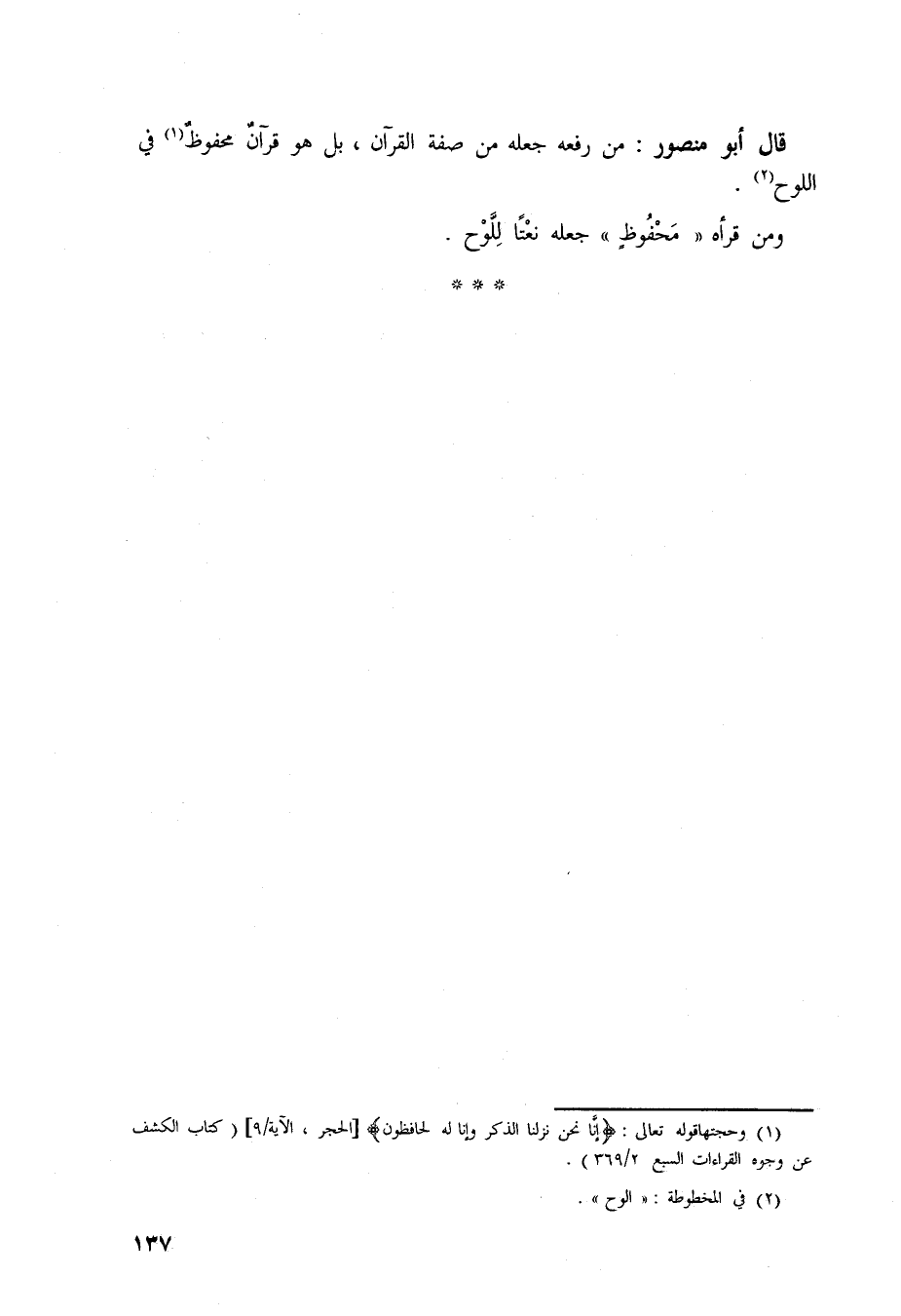 قال أبو منصور: من رفعه جعله من صفة القرآن، بل هو قرَان محفوط في