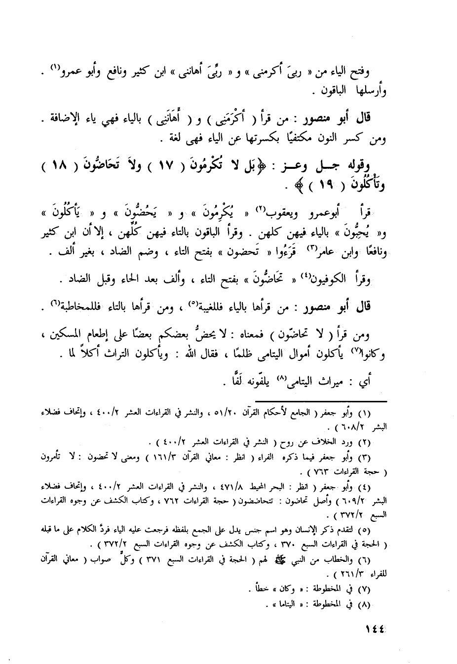 قرأ أبو عمرو ويغقوب (يُكْرِمُونَ) و (يَحُضُّونَ) و (يَأكُلُونَ)