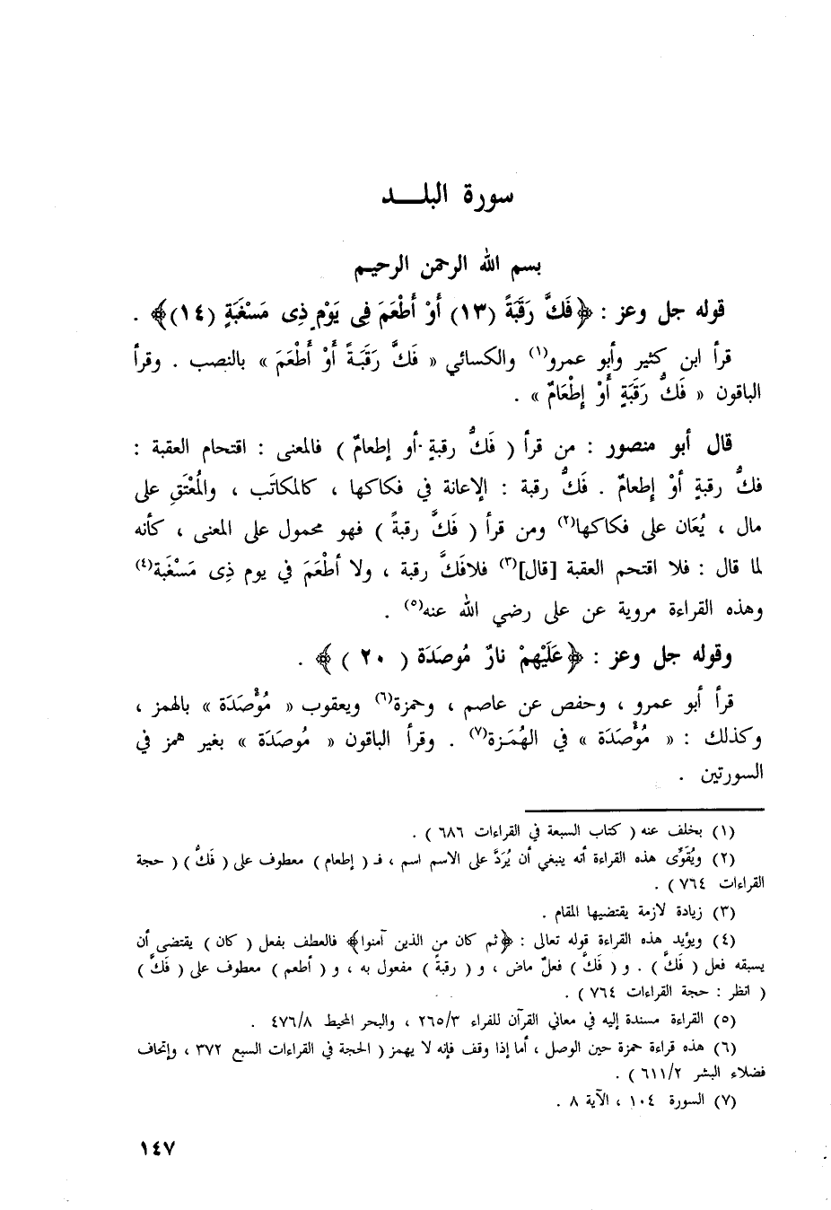 قرأ ابن كثير وأبو عمرو والكسائي (فَكَّ رَقَبَةً أَوْ أطعَمَ) بالنصب.