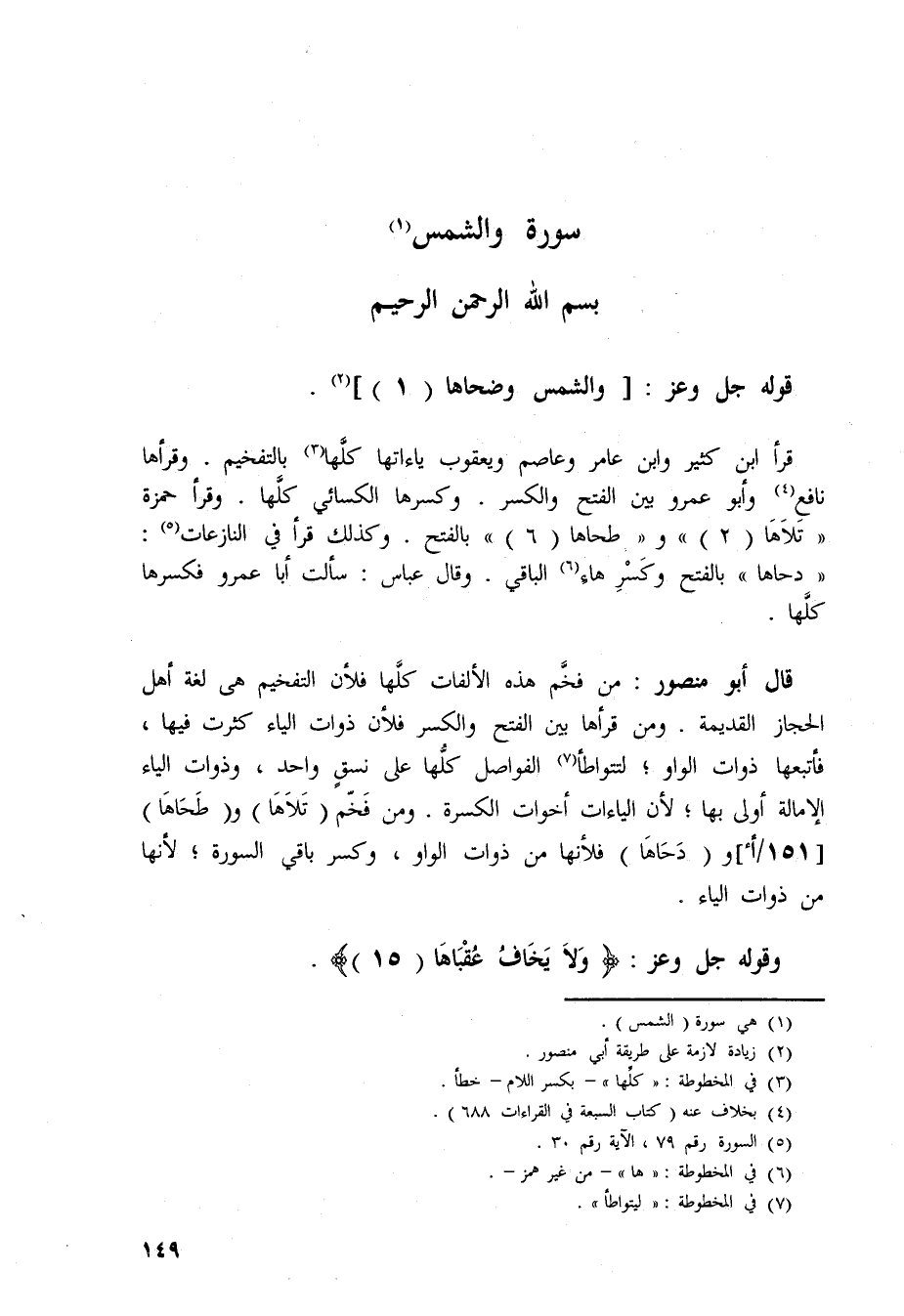 ومن فَخم (تَلاَهَا) و (طَحَاهَا) و (دَحَاهَا) فلأنها من ذوات الواو، وكسر باقي السورة؛ لأنها من ذوات الياء.