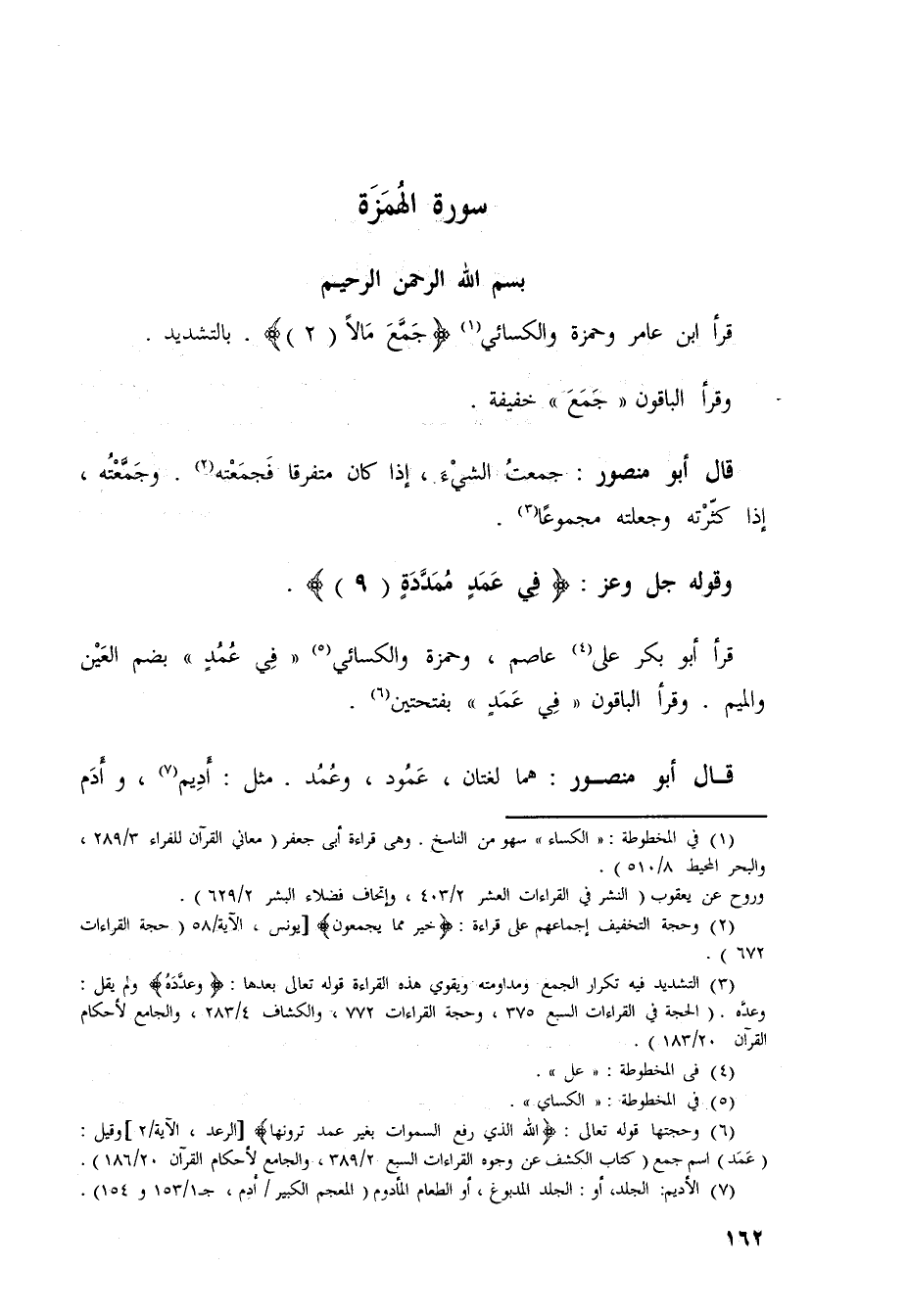 قرأ أبو بكر على عاصم، وحمزة والكسائي (فِى عُمُدٍ)