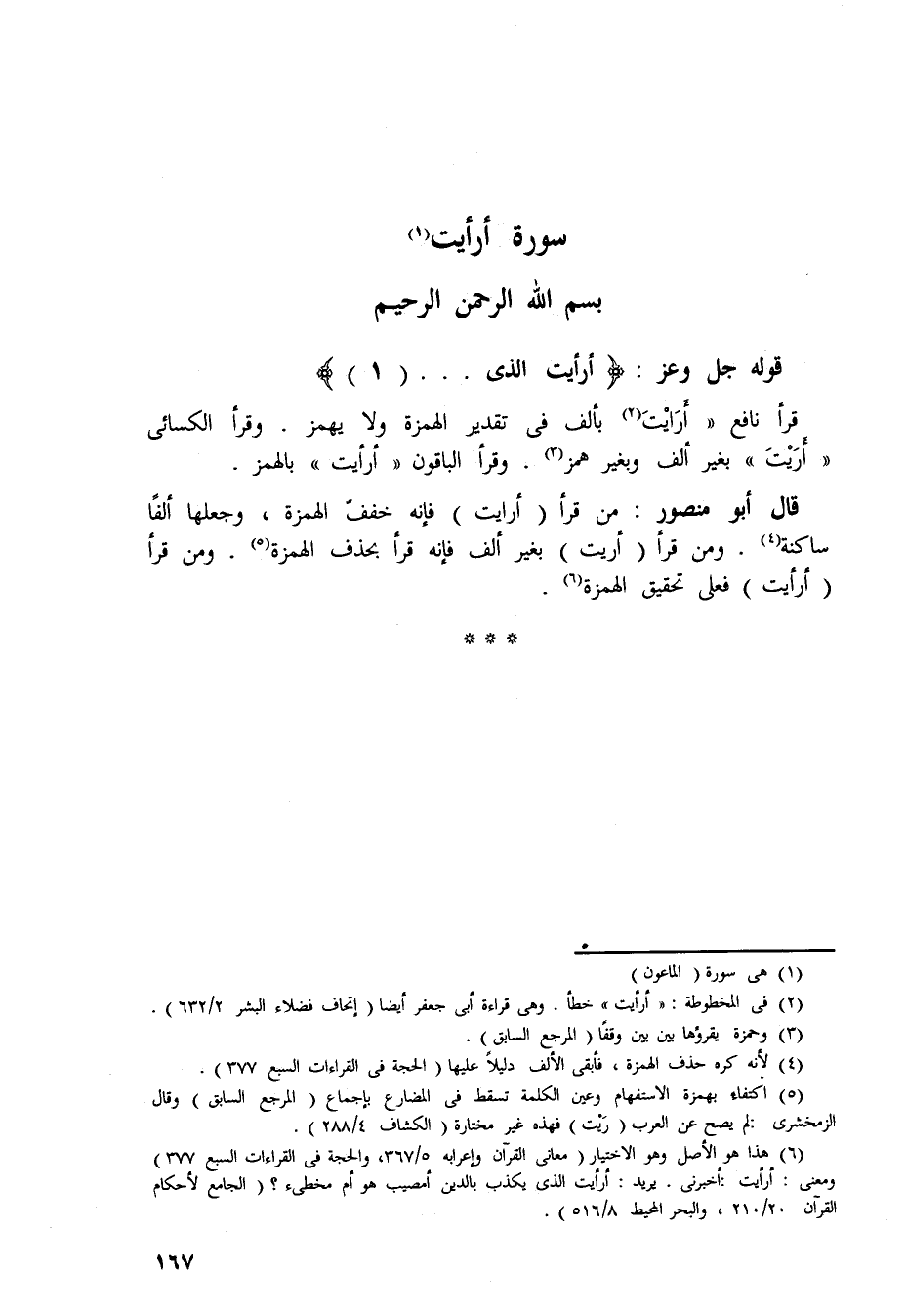 قرأ نافع (أَرَايْتَ) بألف فى تقدير الهمزة ولا يهمز.