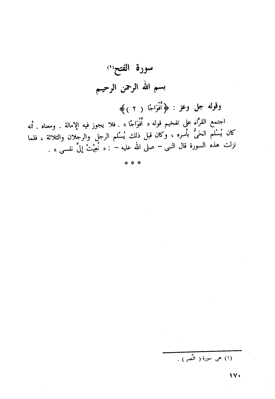 ومعناه. أنه كان يُسْلم الحَيُّ بأسره، وكان قبل ذلك يُسْلم الرجل والرجلان والثلاثة، فلما نزلت هذه السورة قال النبى - صلى الله عليه -: