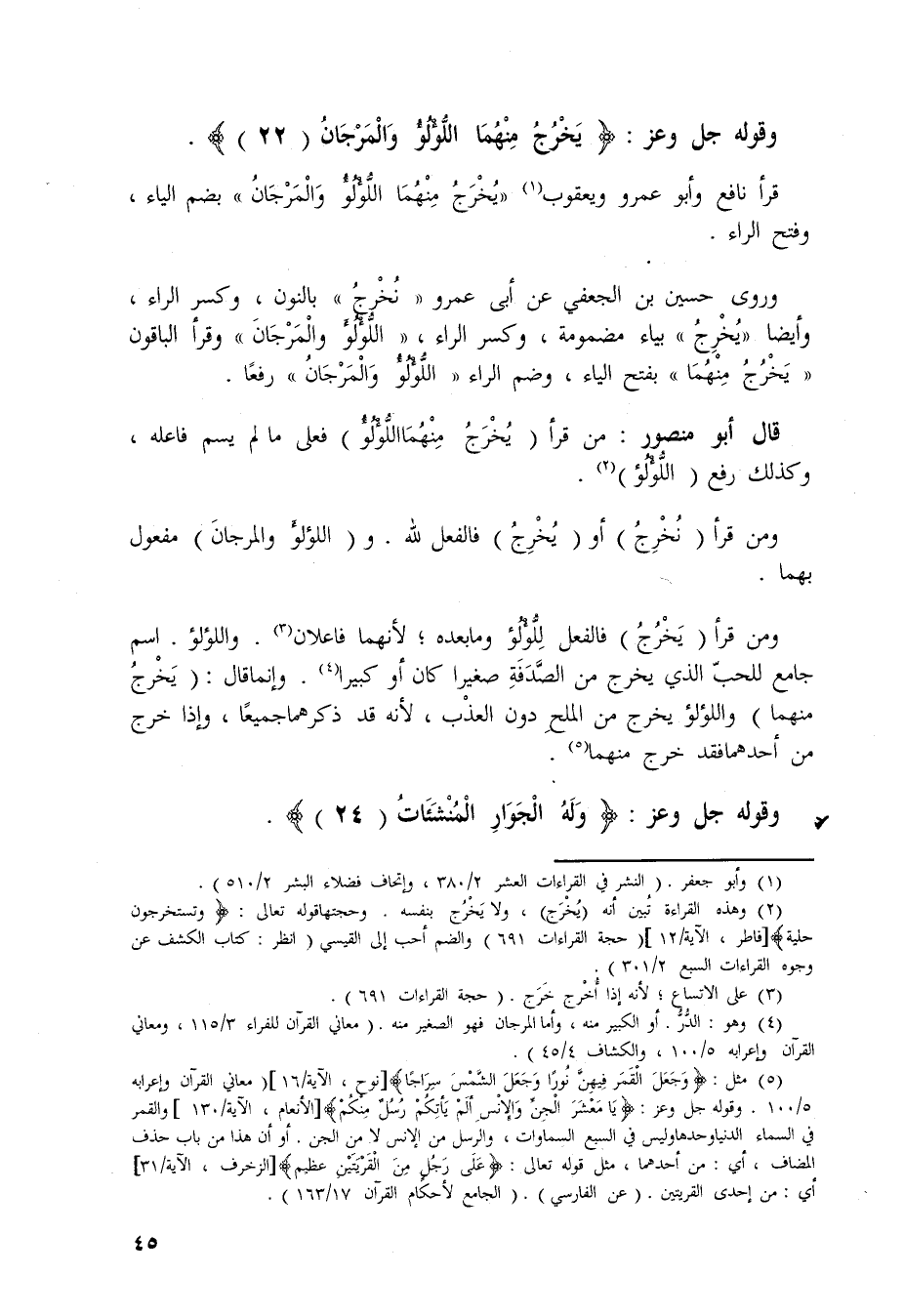 قرأ نافع وأبو عمرو ويعقوب (يُخْرَجُ مِنْهُمَا اللُّؤْلُؤُ وَالْمَرْجَانُ (22)) بضم الياء، وفتح الراء.