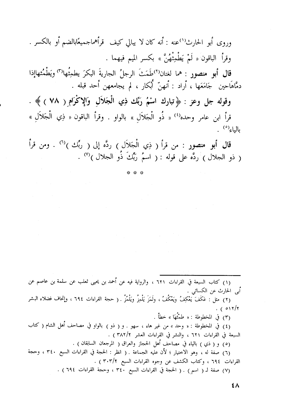 قال أبو منصور: من قرأ (ذي الْجَلاَل) ردَّه إلى (ربِّك) .
