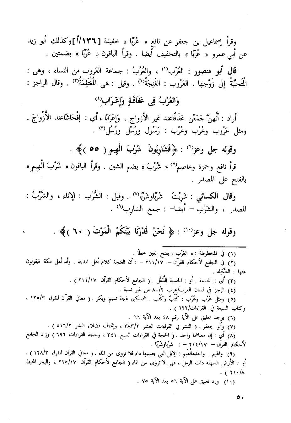 وقرأ إسماعيل بن جعفر عن نافع " عُرْبا " خفيفة، وكذلك أبو زيد