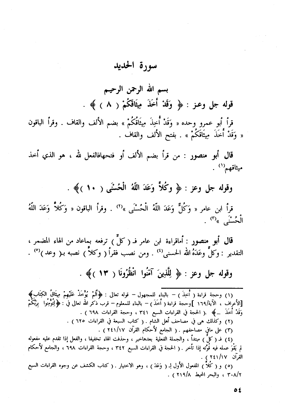 قال أبو منصور: أما قراءة ابن عامر فـ (كُلٌّ) ترفعه بما عاد من الهاء المضمر، التقدير: وكلٌّ وعَدَهُ الله الحسنى.