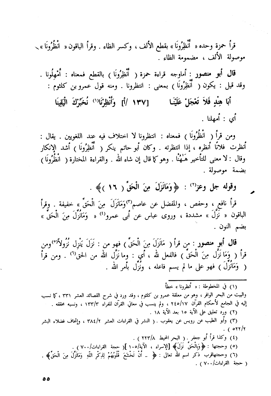قال أبوِ منصور: بن قرأ (مَانَزَلَ مِنَ الْحَقِّ) فهو من: نَزَلَ يَنْزِل نُزُولاً.