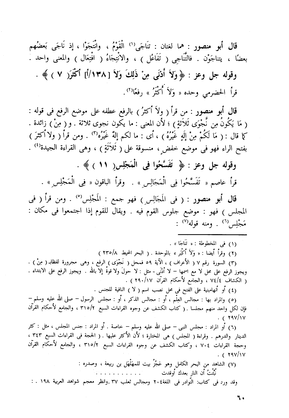 قال أبو منصور: من قرأ (ولاَ أكثرُ) بالرفع عطفه على موضع الرفع فى قوله:
