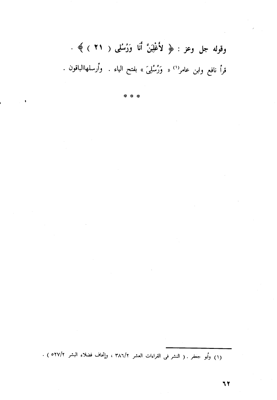 قرأ نافع وابن عامر " وَرُسُلىَ " بفتح الياء.