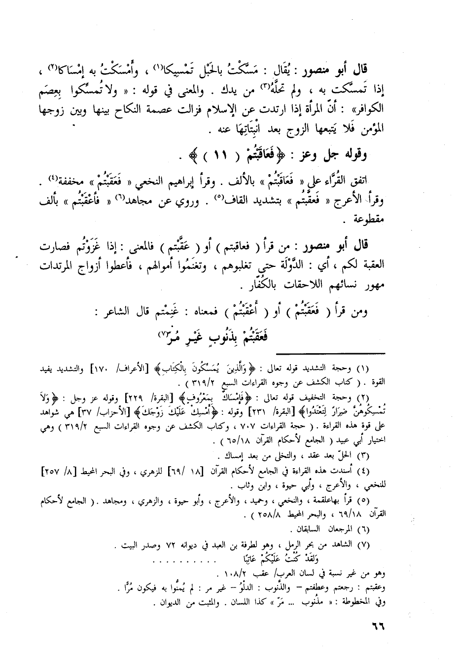 قال أبو منصور: من قرأ (فعاقبتم) أو (عَقَّبْتم) فالمعنى: إذا غَزَوْتُم فصارت