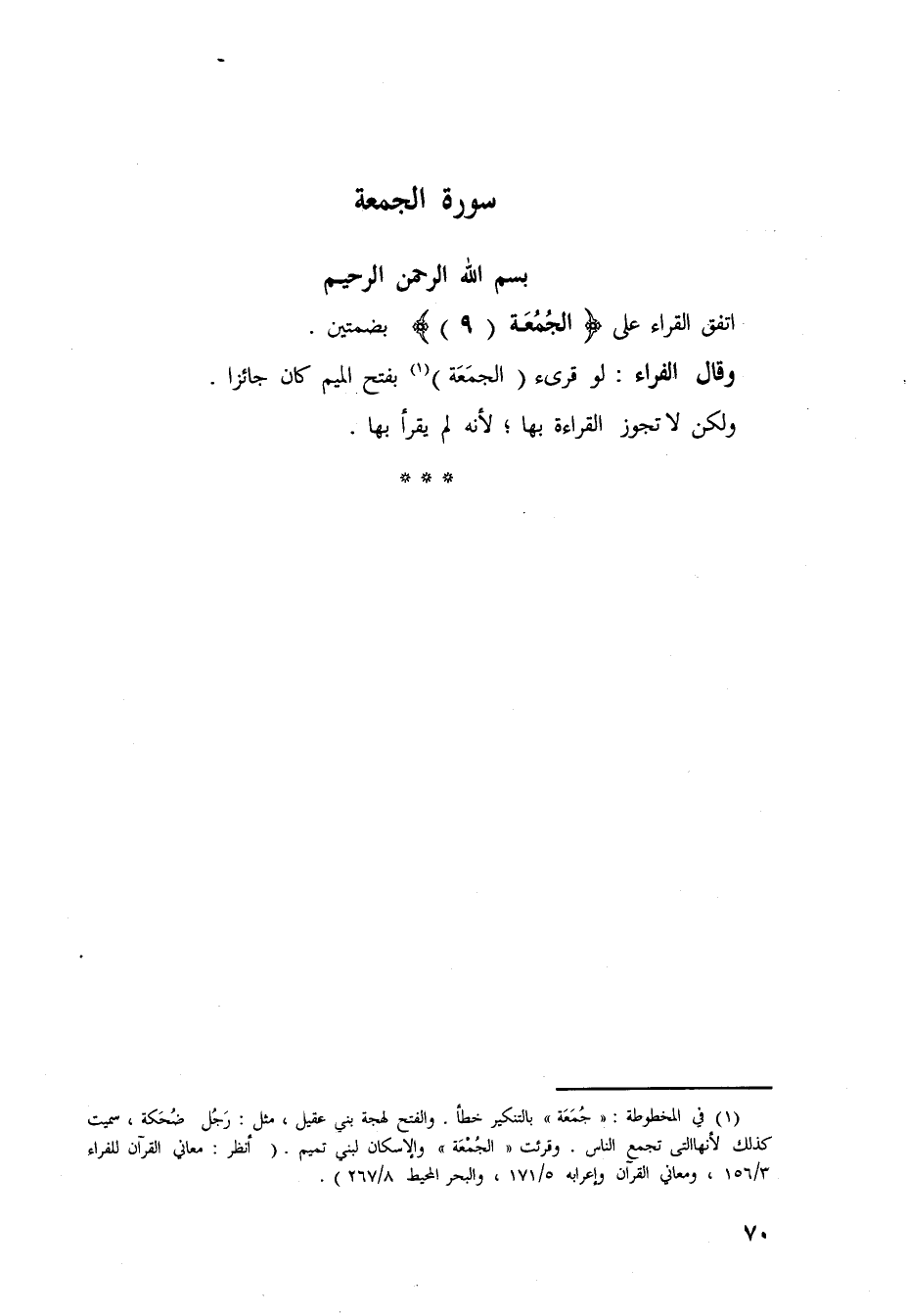 وقال الفراء: لو قرئ (الجمَعَة) بفتح الميم كان جائزا.