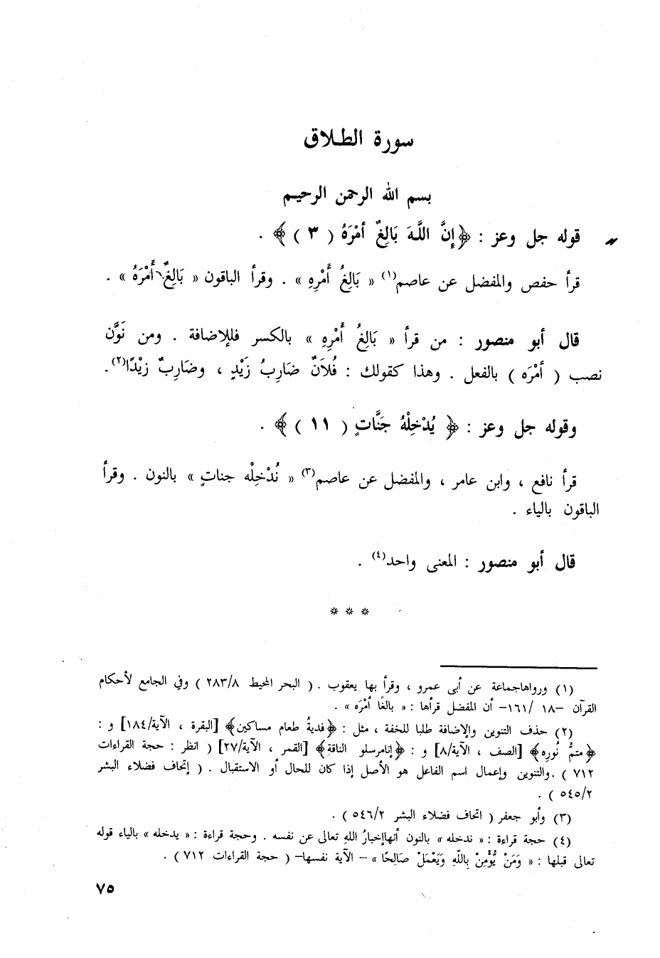 قال أبو منصور: من قرأ (بَالِغُ أمْرِهِ) بالكسر فللإضافة.