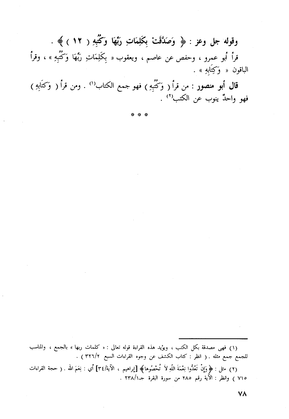 قرأ أبو عمرو، وحفص عن عاصم، ويعقوب (بِكَلِمَاتِ رَبِّهَا وَكُتُبِهِ) ،