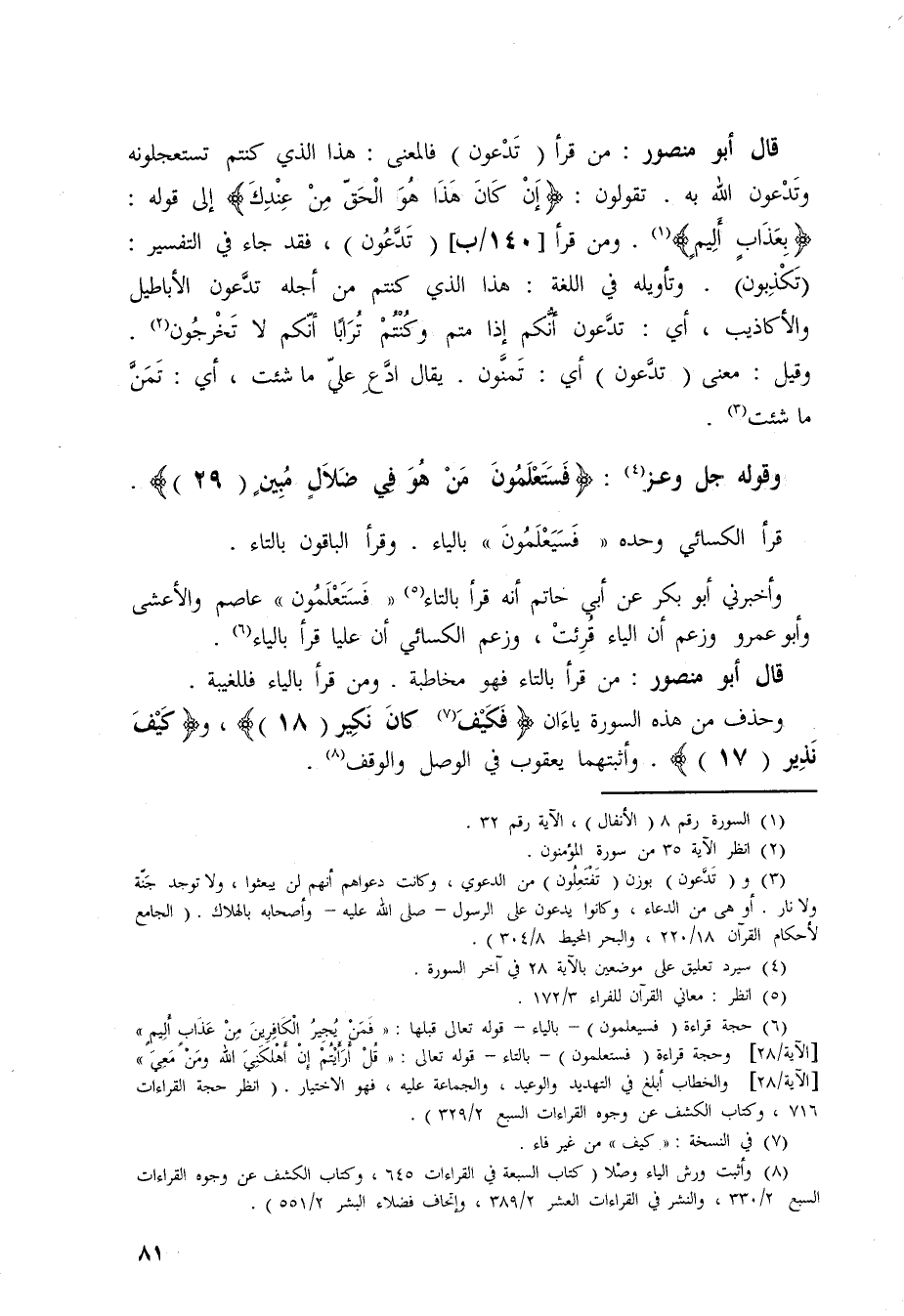 قال أبو منصور: من قرأ بالتاء فهو مخاطبة.