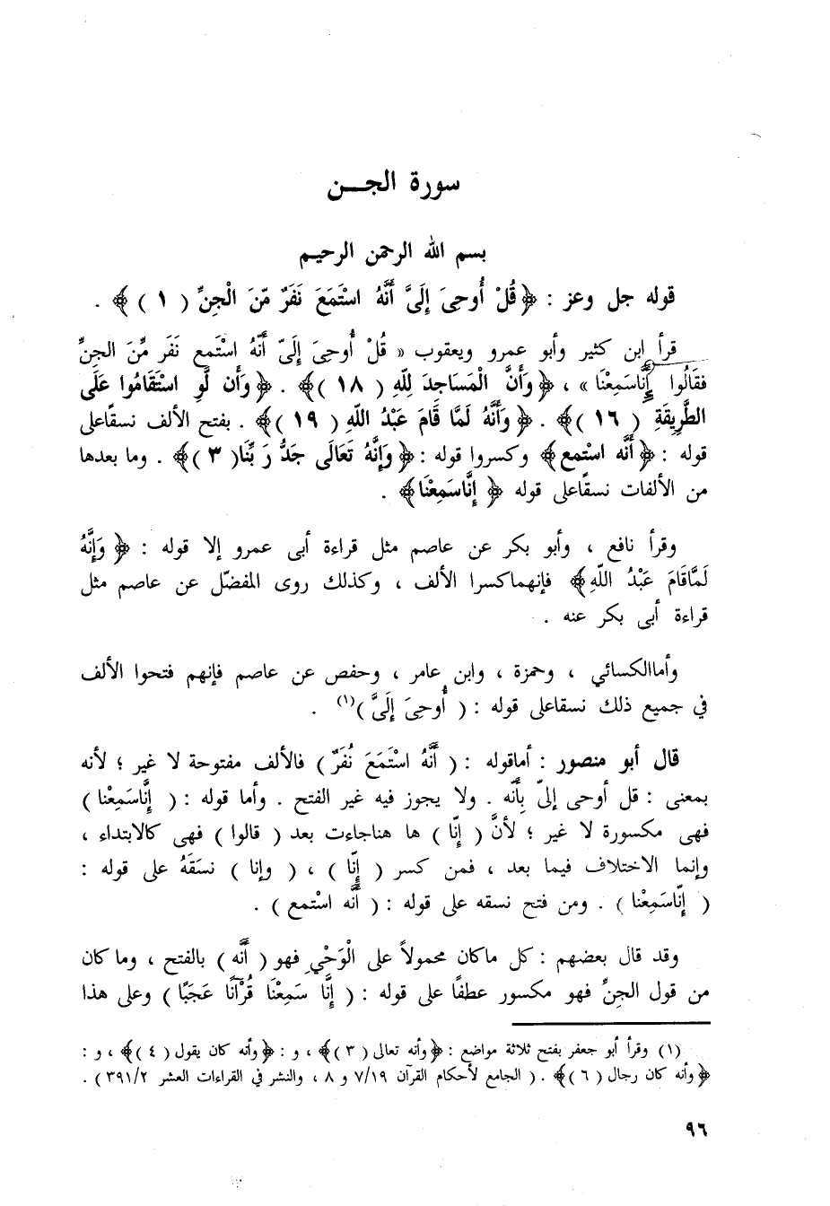 قال أبو منصور: أما قوله: (أنَّهُ اسْتَمَعَ نُفَرٌ) فالألف مفتوحة لا غير؛ لأنه