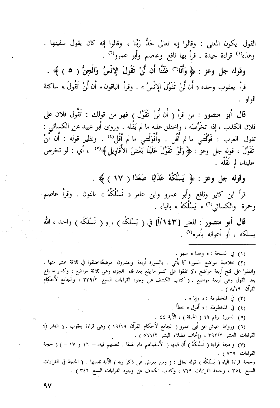 قال أبو منصور: من قرأ (أن لَّنْ تَقَوَّلَ) فهو من قولك: تَقَوَّل فلان على