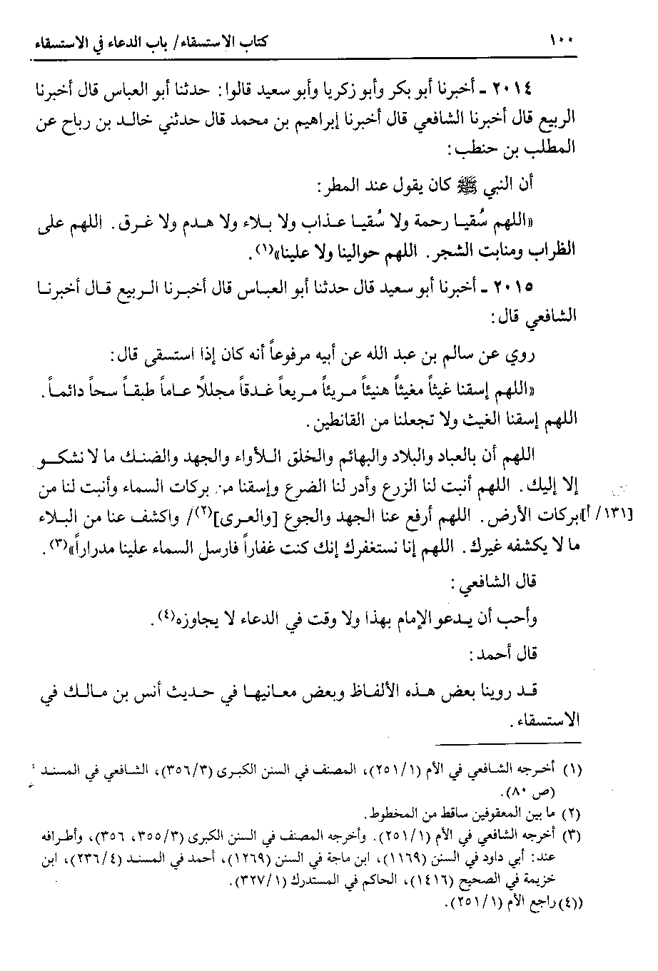 2014 - أخبرنا أبو بكر وأبو زكريا وأبو سعيد قالوا : حدثنا أبو العباس قال أخبرنا الربيع قال أخبرنا الشافعي قال أخبرنا إبراهيم بن محمد قال حدثني خالد بن رباح عن المطلب بن حنطب أن النبي صلى الله عليه وسلم كان يقول عند المطر اللهم سقيا رحمة ولا سقيا عذاب ولا بلاء ولا هدم ولا غرق . اللهم على الظراب ومنابت الشجر . اللهم حوالينا ولا علينا.