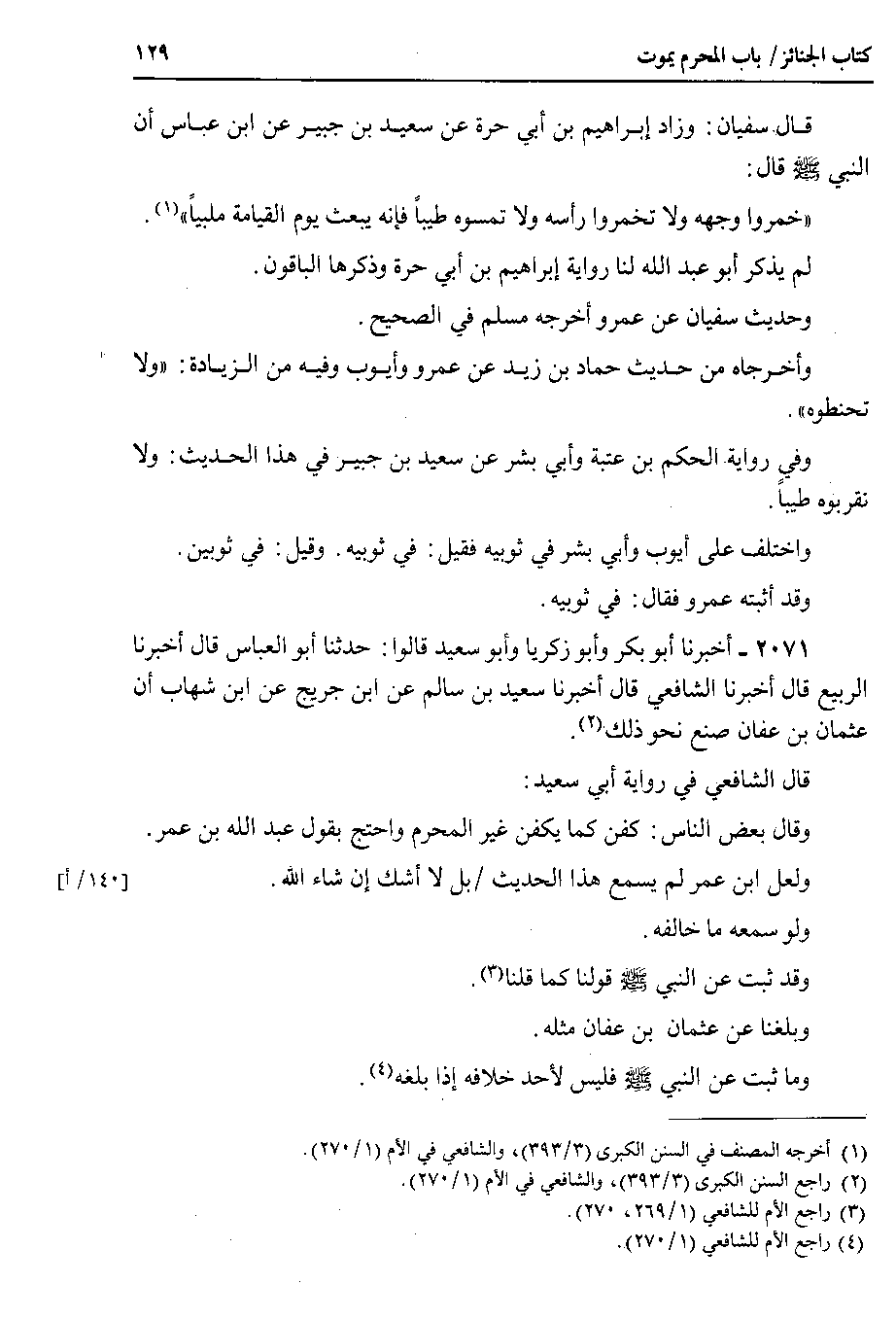 قال الشافعي في رواية أبي سعيد وقال بعض الناس : كفن كما يكفن غير المحرم واحتج بقول عبد الله بن عمر.