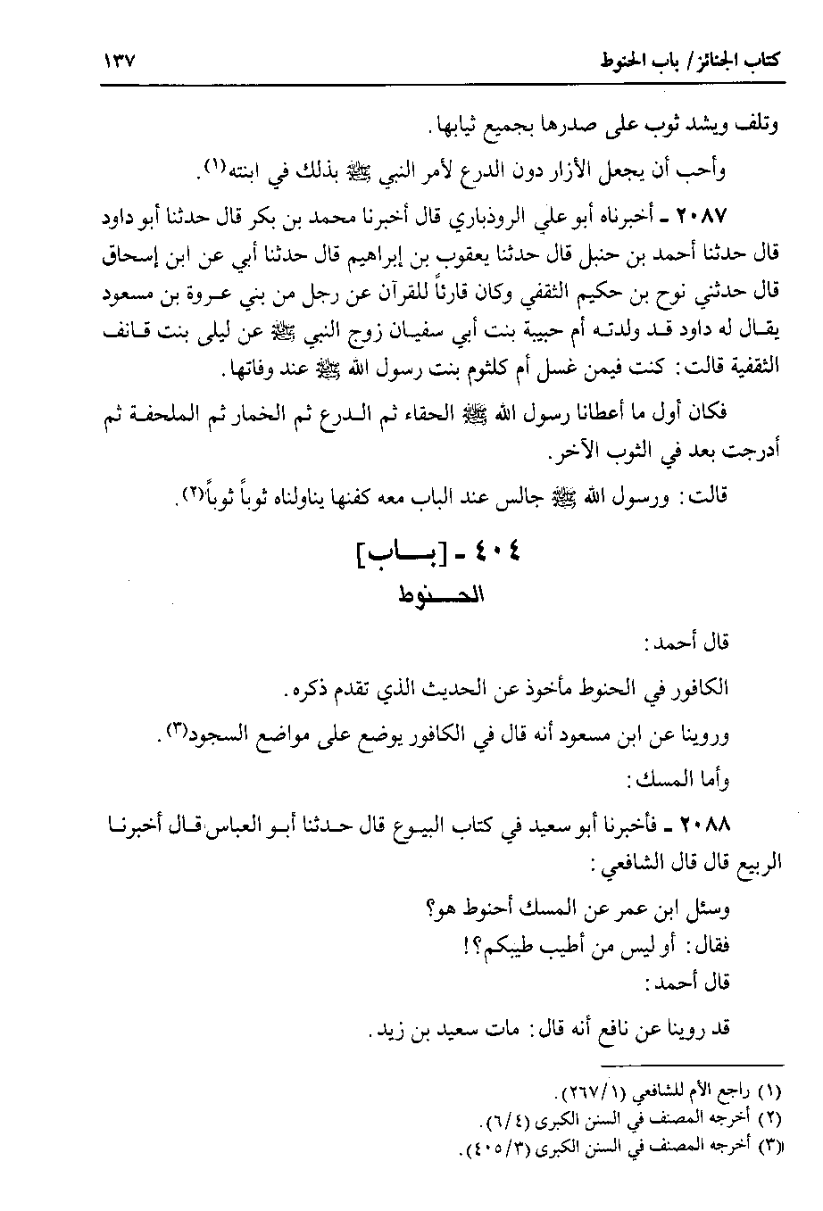 وأما المسك 2088 - فأخبرنا أبو سعيد في كتاب البيوع قال حدثنا أبو العباس قال أخبرنا الربيع قال قال الشافعي وسئل ابن عمر عن المسك أحنوط هو ؟ فقال : أو ليس من أطيب طيبكم ؟ ! قال أحمد قد روينا عن نافع أنه قال : مات سعيد بن زيد.