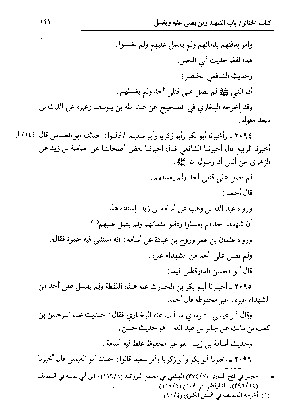 ورواه عثمان بن عمر وروح بن عبادة عن أسامة : أنه استثنى فيه حمزة فقال ولم يصل على أحد من الشهداء غيره.