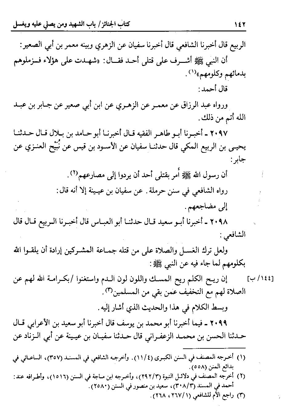 الربيع قال أخبرنا الشافعي قال أخبرنا سفيان عن الزهري وبينه معمر بن أبي الصعير أن النبي صلى الله عليه وسلم أشرف على قتلى أحد فقال : شهدت على هؤلاء فزملوهم بدمائهم وكلومهم.
