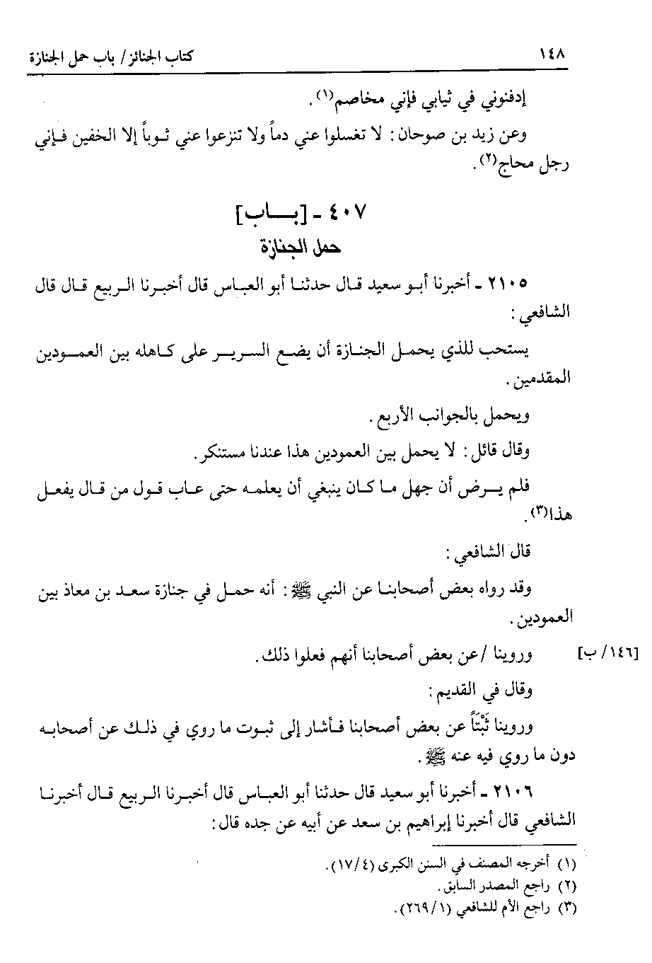 2105 - أخبرنا أبو سعيد قال حدثنا أبو العباس قال أخبرنا الربيع قال قال الشافعي يستحب للذي يحمل الجنازة أن يضع السرير على كاهله بين العمودين المقدمين.