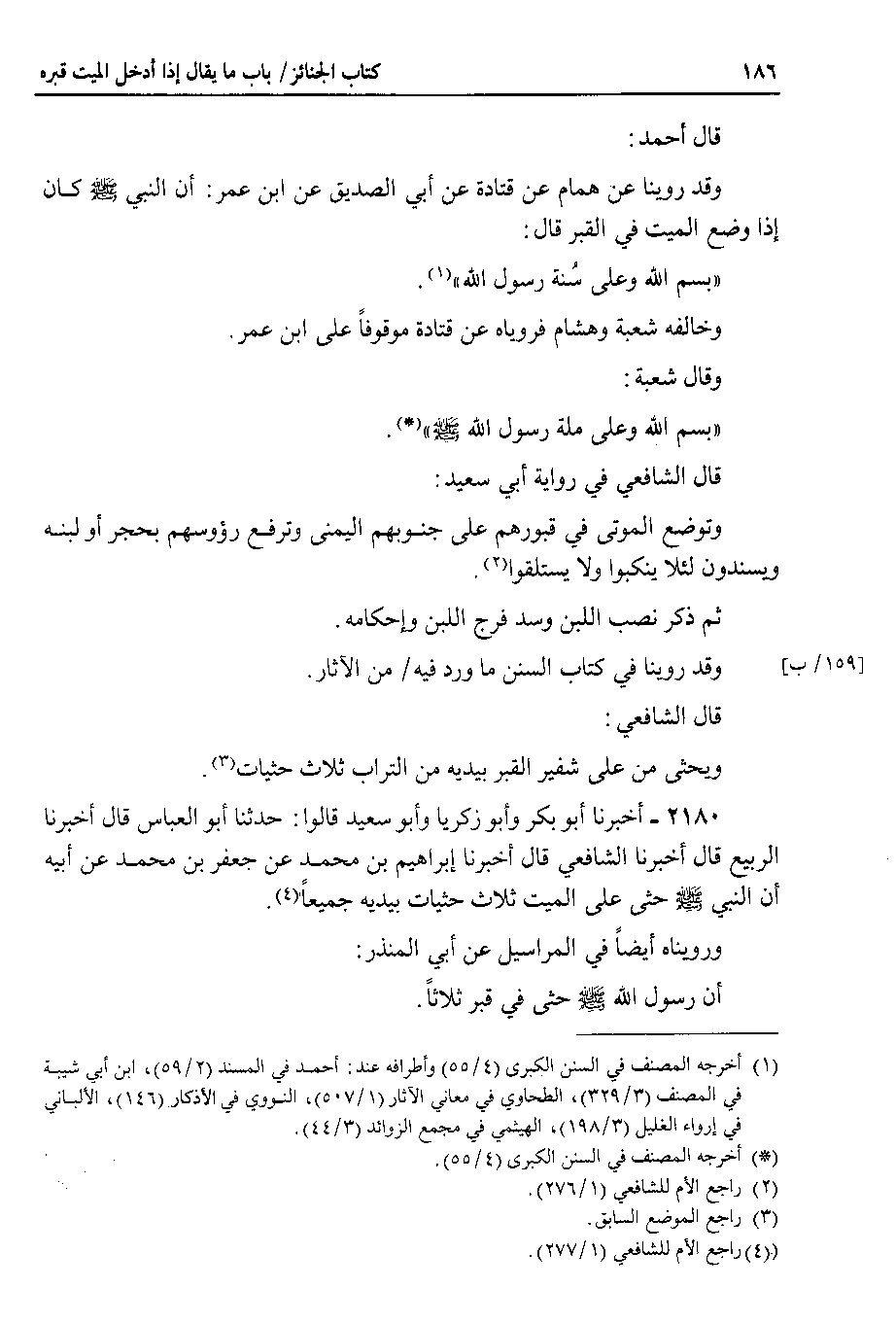 قال أحمد وقد روينا عن همام عن قتادة عن أبي الصديق عن ابن عمر : أن النبي صلى الله عليه وسلم كان إذا وضع الميت في القبر قال بسم الله وعلى سنة رسول الله.