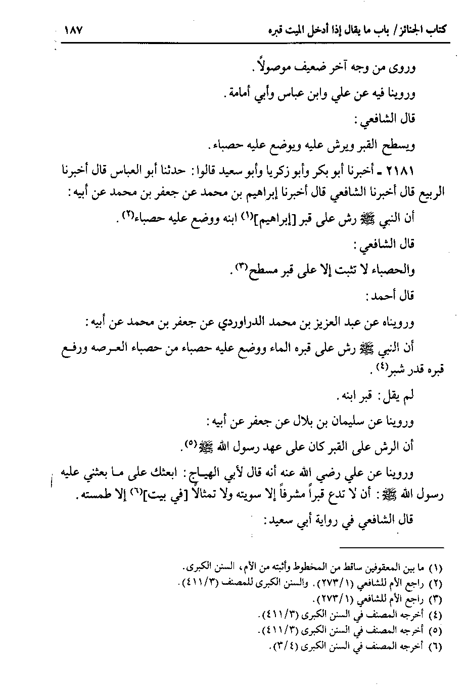 قال أحمد ورويناه عن عبد العزيز بن محمد الدراوردي عن جعفر بن محمد عن أبيه أن النبي صلى الله عليه وسلم رش على قبره الماء ووضع عليه حصباء من حصباء العرصه ورفع قبره قدر شبر.