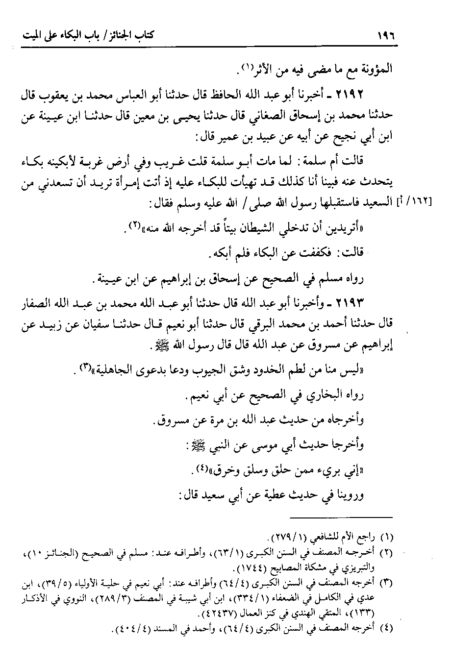 2192 - أخبرنا أبو عبد الله الحافظ قال حدثنا أبو العباس محمد بن يعقوب قال حدثنا محمد بن إسحاق الصغاني قال حدثنا يحيى بن معين قال حدثنا ابن عيينة عن ابن أبي نجيح عن أبيه عن عبيد بن عمير قال قالت أم سلمة : لما مات أبو سلمة قلت غريب وفي أرض غربة لأبكينه بكاء يتحدث عنه فبينا أنا كذلك قد تهيأت للبكاء عليه إذ أتت امرأة تريد أن تسعدني من السعيد فاستقبلها رسول الله صلى الله عليه وسلم فقال أتريدين أن تدخلي الشيطان بيتاً قد أخرجه الله منه.