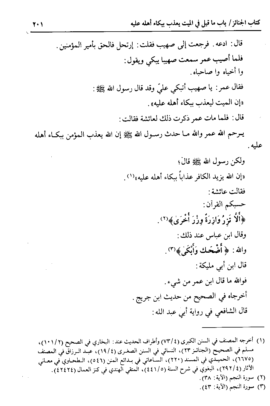 ففال عمر : يا صهيب أتبكي علي وقد قال رسول الله صلى الله عليه وسلم إن الميت ليعذب ببكاء أهله عليه.