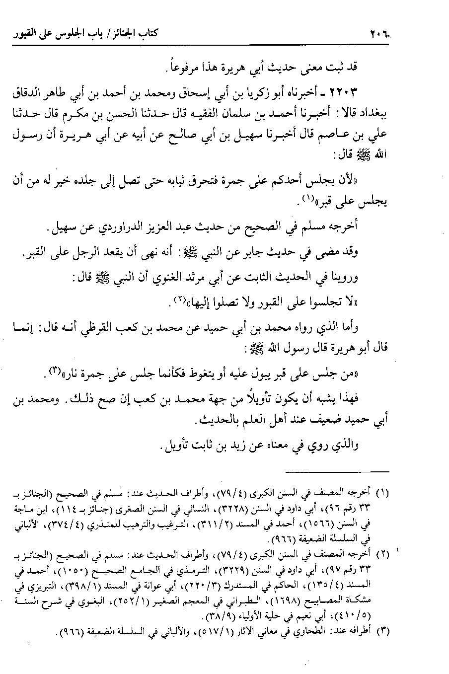 2203 - أخبرناه أبو زكريا بن أبي إسحاق ومحمد بن أحمد بن أبي طاهر الدقاق ببغداد قالا : أخبرنا أحمد بن سلمان الفقيه قال حدثنا الحسن بن مكرم قال حدثنا علي بن عاصم قال أخبرنا سهيل بن أبي صالح عن أبيه عن أبي هريرة أن رسول الله صلى الله عليه وسلم قال لأن يجلس أحدكم على جمرة فتحرق ثيابه حتى تصل إلى جلده خير له من أن يجلس على قبر.