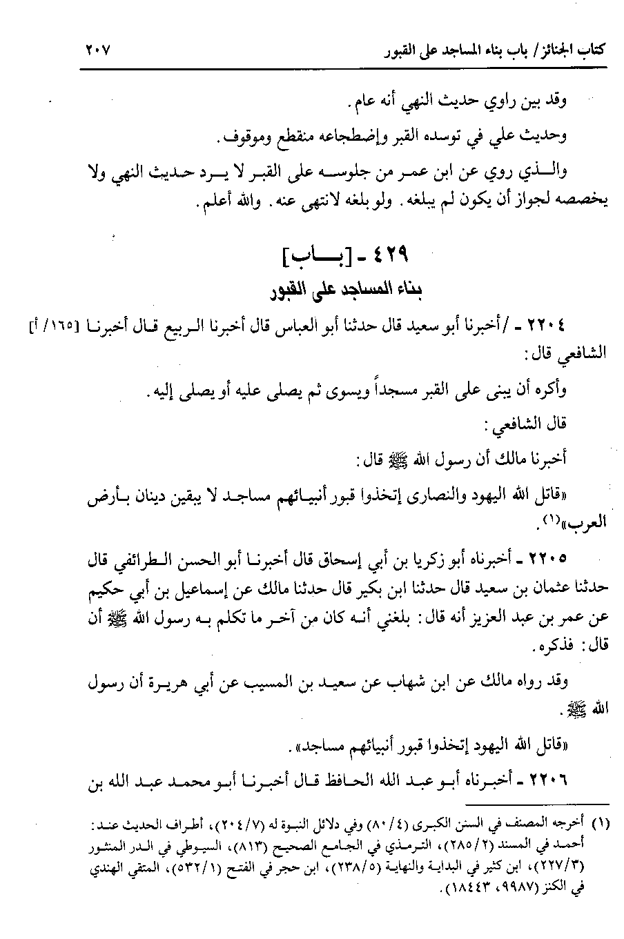2204 - أخبرنا أبو سعيد قال حدثنا أبو العباس قال أخبرنا الربيع قال أخبرنا الشافعي قال وأكره أن يبنى على القبر مسجداً ويسوى ثم يصلى عليه أو يصلى إليه.