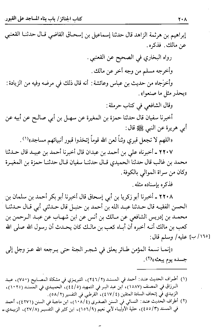 2208 - أخبرنا أبو زكريا بن أبي إسحاق قال أخبرنا أبو بكر أحمد بن سلمان بن الحسن الفقيه قال حدثنا عبد الله بن أحمد بن حنبل قال حدثني أبي قال حدثنا محمد بن إدريس الشافعي عن مالك بن أنس عن ابن شهاب عن عبد الرحمن بن كعب بن مالك أنه أخبره أن أباه كعب بن مالك كان يحدث أن رسول الله صلى الله عليه وسلم قال إنما نسمة المؤمن طائر يعلق في شجر الجنة حتى يرجعه الله عز وجل إلى جسده يوم يبعثه.