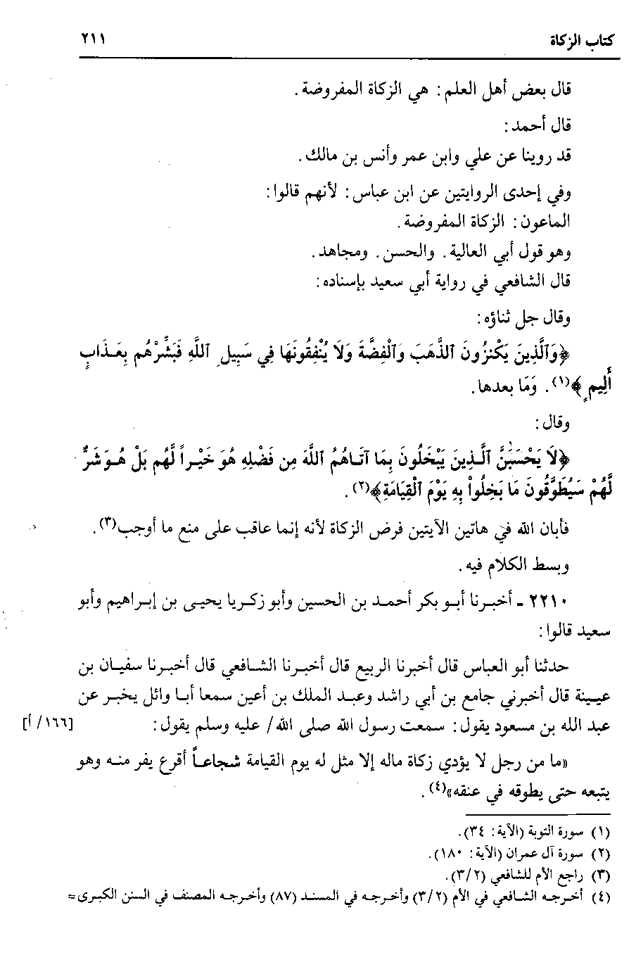 2210 - أخبرنا أبو بكر أحمد بن الحسين وأبو زكريا يحيى بن إبراهيم وأبو سعيد قالوا حدثنا أبو العباس قال أخبرنا الربيع قال أخبرنا الشافعي قال أخبرنا سفيان بن عيينة قال أخبرني جامع بن أبي راشد وعبد الملك بن أعين سمعا أبا وائل يخبر عن عبد الله بن مسعود يقول : سمعت رسول الله صلى الله عليه وسلم يقول ما من رجل لا يؤدي زكاة ماله إلا مثل له يوم القيامة شجاعاً أقرع يفر منه وهو يتبعه حتى يطوقه في عنقه.