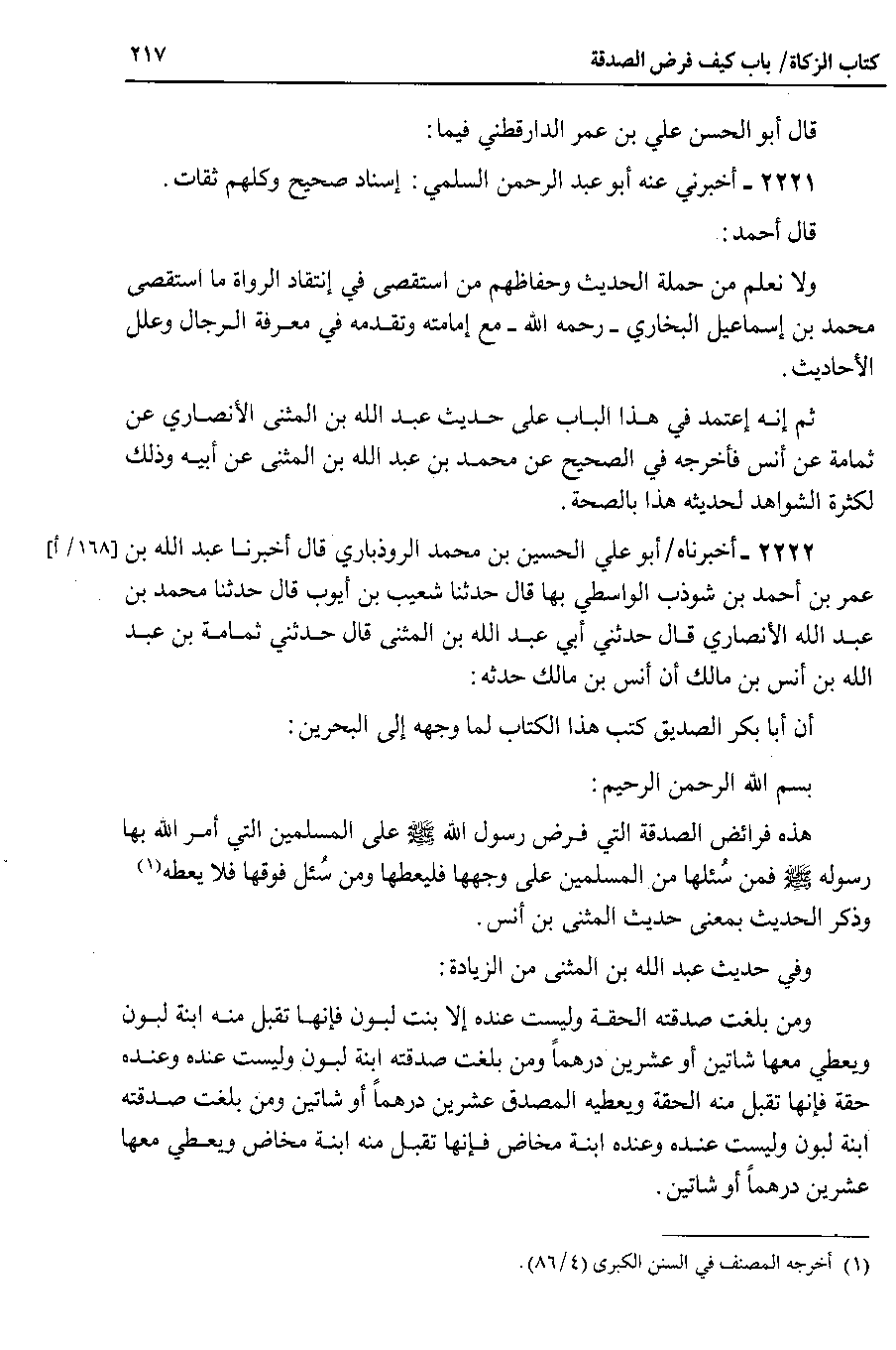 2222 - أخبرناه أبو علي الحسين بن محمد الروذباري قال أخبرنا عبد الله بن عمر بن أحمد بن شوذب الواسطي بها قال حدثنا شعيب بن أيوب قال حدثنا محمد بن عبد الله الأنصاري قال حدثني أبي عبد الله بن المثنى قال حدثني ثمامة بن عبد الله بن أنس بن مالك أن أنس بن مالك حدثه أن أبا بكر الصديق كتب هذا الكتاب لما وجهه إلى البحرين بسم الله الرحمن الرحيم هذه فرائض الصدقة التي فرض رسول الله صلى الله عليه وسلم على المسلمين التي أمر الله بها رسوله صلى الله عليه وسلم فمن سئلها من المسلمين على وجهها فليعطها ومن سئل فوقها فلا يعطه وذكر الحديث بمعنى حديث المثنى بن أنس.