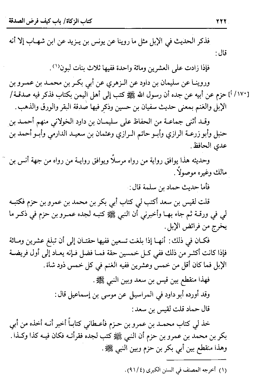 فأما حديث حماد بن سلمة قال قلت لقيس بن سعد أكتب لي كتاب أبي بكر بن محمد بن عمرو بن حزم فكتبه لي في ورقة ثم جاء بها وأخبرني أن النبي صلى الله عليه وسلم كتبه لجده عمرو بن حزم في ذكر ما يخرج من فرائض الإبل.