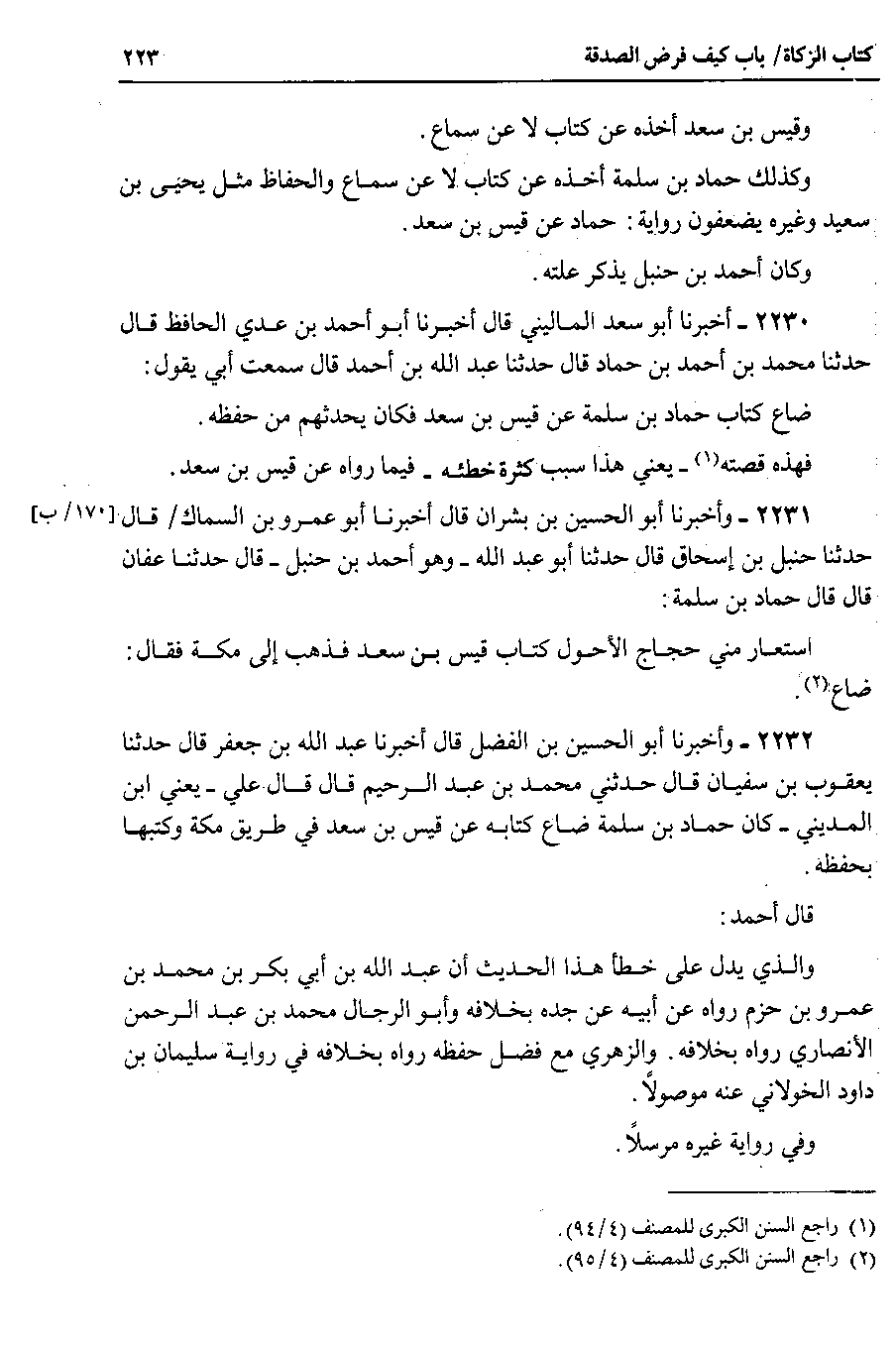2232 - وأخبرنا أبو الحسين بن الفضل قال أخبرنا عبد الله بن جعفر قال حدثنا يعقوب بن سفيان قال حدثني محمد بن عبد الرحيم قال قال علي _ يعني ابن المديني _ كان حماد بن سلمة ضاع كتابه عن قيس بن سعد في طريق مكة وكتبها بحفظه.