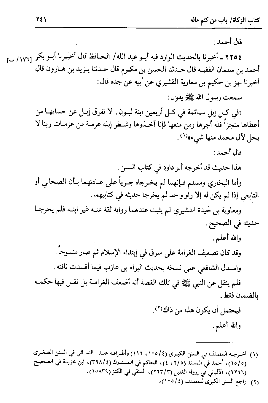 قال أحمد 2254 - أخبرنا بالحديث الوارد فيه أبو عبد الله الحافظ قال أخبرنا أبو بكر أحمد بن سلمان الفقيه قال حدثنا الحسن بن مكرم قال حدثنا يزيد بن هارون قال أخبرنا بهز بن حكيم بن معاوية القشيري عن أبيه عن جده قال سمعت رسول الله صلى الله عليه وسلم يقول في كل إبل سائمة في كل أربعين ابنة لبون . لا تفرق إبل عن حسابها من أعطاها منجزاً فله أجرها ومن منعها فإنا آخذوها وشطر إبله عزمة من عزمات ربنا لا يحل لآل محمد منها شيء.