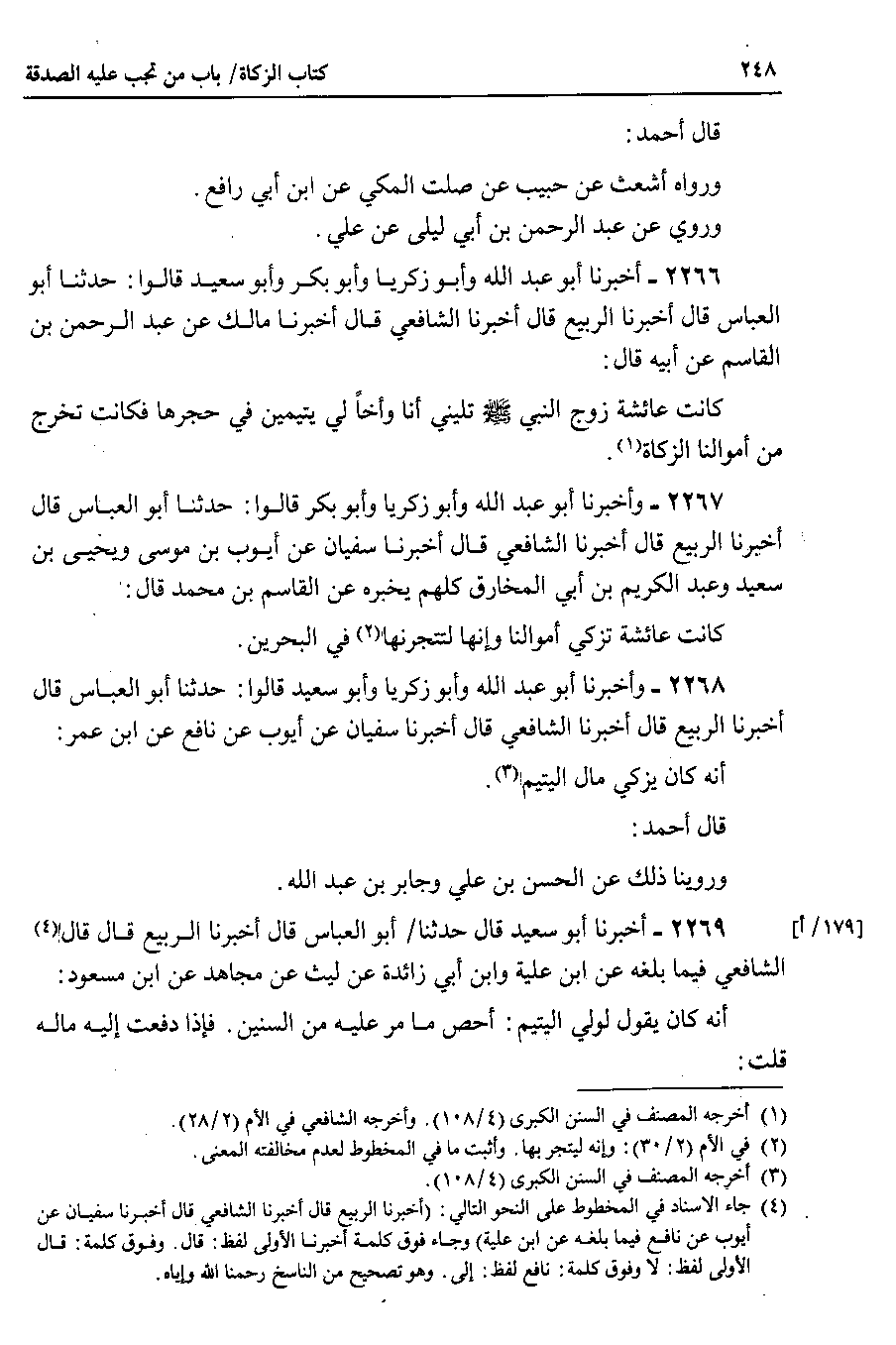 2268 - وأخبرنا أبو عبد الله وأبو زكريا وأبو سعيد قالوا : حدثنا أبو العباس قال أخبرنا الربيع قال أخبرنا الشافعي قال أخبرنا سفيان عن أيوب عن نافع عن ابن عمر أنه كان يزكي مال اليتيم.
