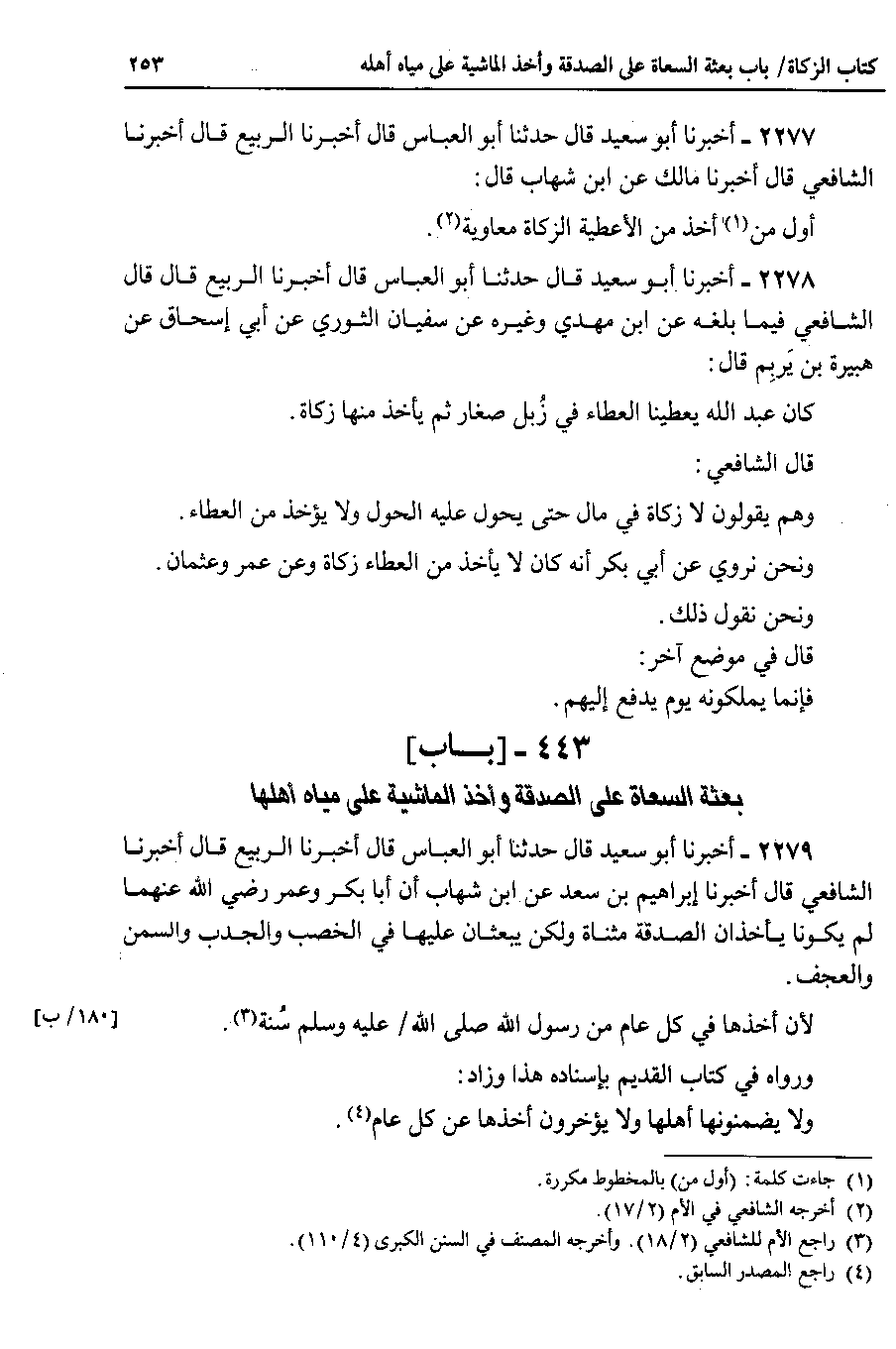 2277 - أخبرنا أبو سعيد قال حدثنا أبو العباس قال أخبرنا الربيع قال أخبرنا الشافعي قال أخبرنا مالك عن ابن شهاب قال أول من أخذ من الأعطية الزكاة معاوية.