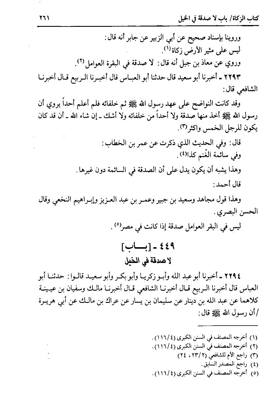 2293 - أخبرنا أبو سعيد قال حدثنا أبو العباس قال أخبرنا الربيع قال أخبرنا الشافعي قال وقد كانت النواضح على عهد رسول الله صلى الله عليه وسلم ثم خلفائه فلم أعلم أحداً يروي أن رسول الله صلى الله عليه وسلم أخذ منها صدقة ولا أحداً من خلفائه ولا أشك _ إن شاء الله _ أن قد كان يكون للرجل الخمس وأكثر.