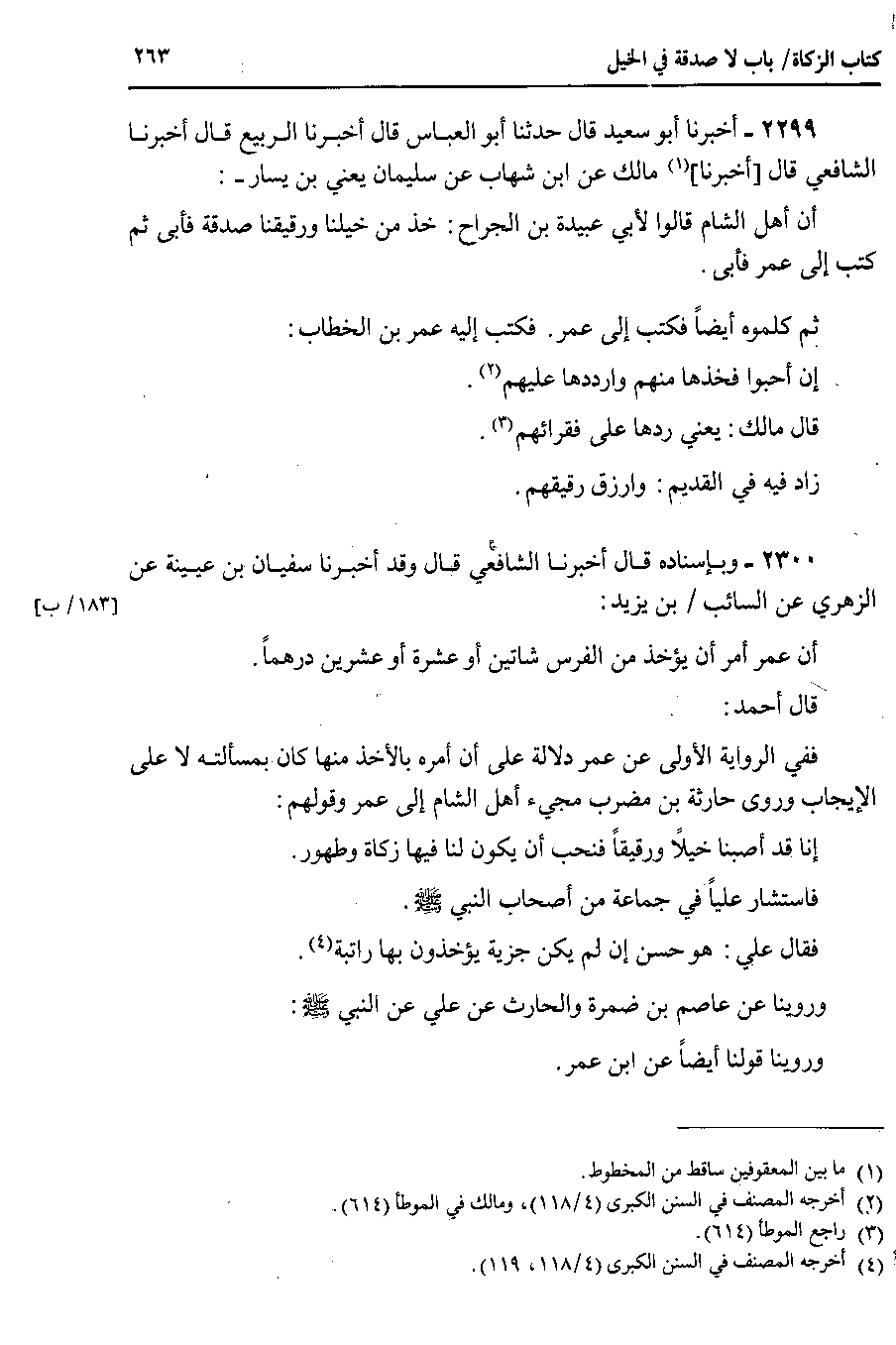 2300 - وبإسناده قال أخبرنا الشافعي قال وقد أخبرنا سفيان بن عيينة عن الزهري عن السائب بن يزيد أن عمر أمر أن يؤخذ من الفرس شاتين أو عشرة أو عشرين درهماً.