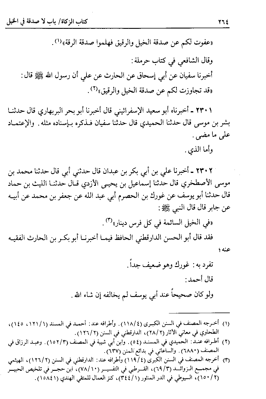 2302 - أخبرنا علي بن أبي بكر بن عبدان قال حدثني أبي قال حدثنا محمد بن موسى الأصطخري قال حدثنا إسماعيل بن يحيى الأزدي قال حدثنا الليث بن حماد قال حدثنا أبو يوسف عن غورك بن الحصرم أبي عبد الله عن جعفر بن محمد عن أبيه عن جابر قال قال النبي صلى الله عليه وسلم في الخيل السائمة في كل فرس دينار.